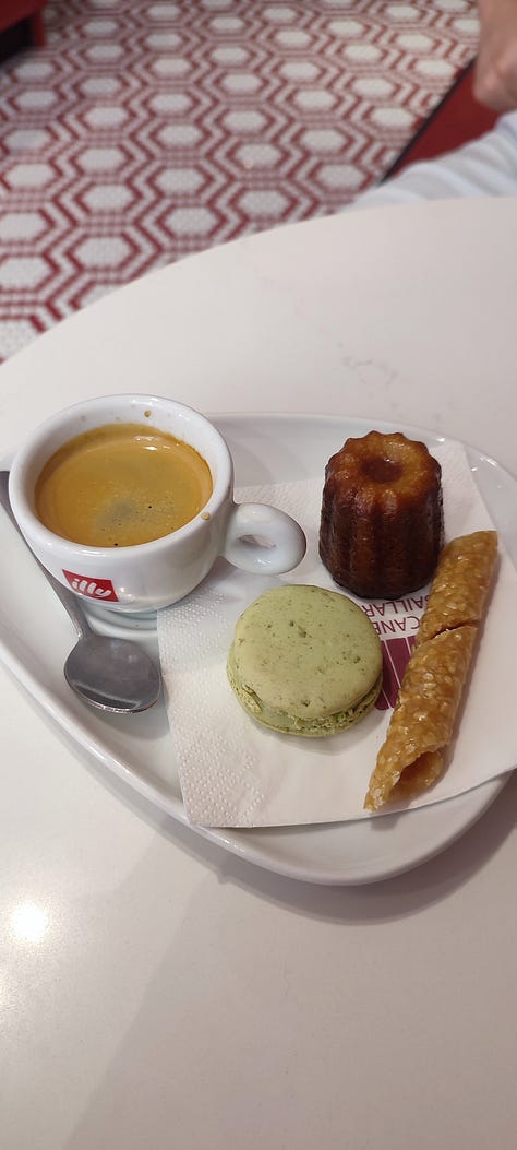 As principais lojas de canelé em Bordeaux são a Baillardran e a La Toque Cuivrée. Experimentei os dois e gostei bem mais do segundo. As lojas da Baillardran são lindas, decoradas em cada detalhe, cheias de vermelho, veludo e forminhas de cobre por toda parte, e o produto reflete tudo isso no preço: 3 euros por uma unidade. Tinha bastante baunilha, o que é ótimo, mas quase nenhum sabor de rum - e esse é o sabor mais importante nesse doce. Já as lojas da La Toque Cuivrée eram só balcões bem simples dando diretamente pra rua, sempre com uma pequena fila, carinha de street food e preço idem: 75 centavos de euro por uma unidade grande! Nessas, o sabor de rum era bem presente e isso ganhou meu paladar. O fato de ser um local menos pretensioso, não prometer nada e entregar tudo, ganhou meu coração. Eles tem lojas em vários locais da França (incluindo Paris, na Gare Montparnasse) e eu super recomendo a visita.